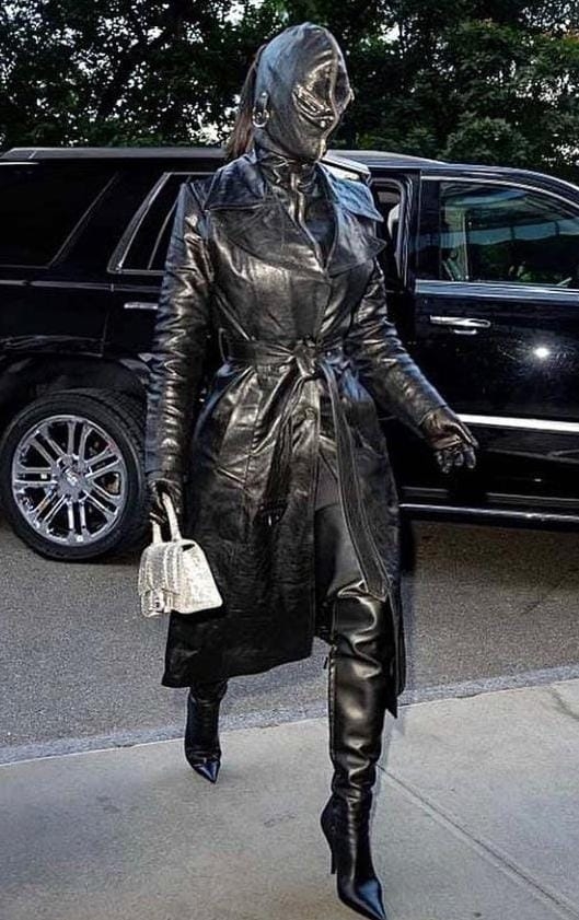 Kim Kardashian a purtat pe străzile din New York un trench cu o centură legată în jurul taliei, cizme peste genunchi, mănuși și o mască care îi acoperea complet fața. Toate piesele vestimentare erau din piele de culoare neagră. Ținuta vedetei valorează aproape 10.000 de dolari, potrivit Insider, toate sub semnătura brandului Balenciaga.