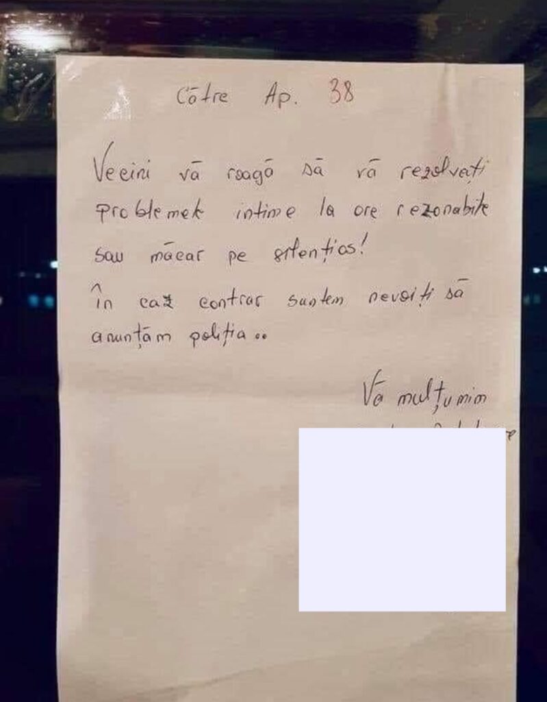 Vecinii vă roagă să vă rezolvați problemele intime la ore rezonabile sau măcar pe silențios. În caz contrar, suntem nevoiți să anunțăm Poliția. Vă mulțumim pentru înțelegere! Cu drag, locatarii.”