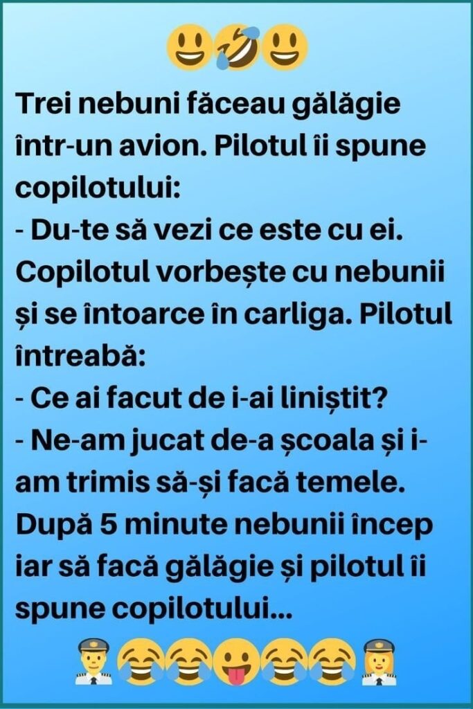 Trei nebuni făceau gălăgie într-un avion. Pilotul îi spune copilotului:
